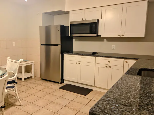 What sets this room apart is the small kitchenette area, perfect for preparing quick meals or snacks. The kitchenette includes a counter space with an electric stovetop, allowing you to cook at your convenience during your stay. Whether you're brewing a cup of coffee in the morning or preparing dinner after a day at the beach, you’ll feel right at home.