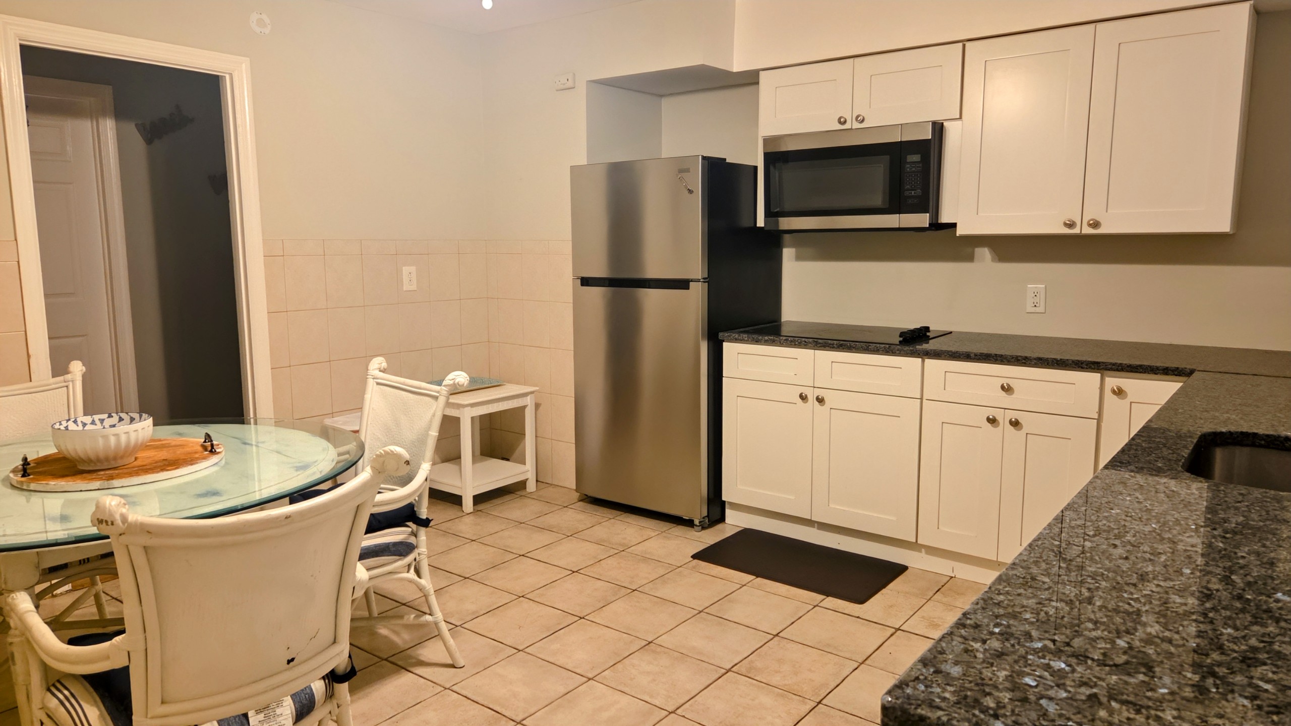 The full-size kitchen is fully equipped with everything you need to prepare meals during your stay, including an electric stovetop, full-size fridge, and plenty of counter space for meal prep. The dining area provides a cozy spot to enjoy your home-cooked meals together.